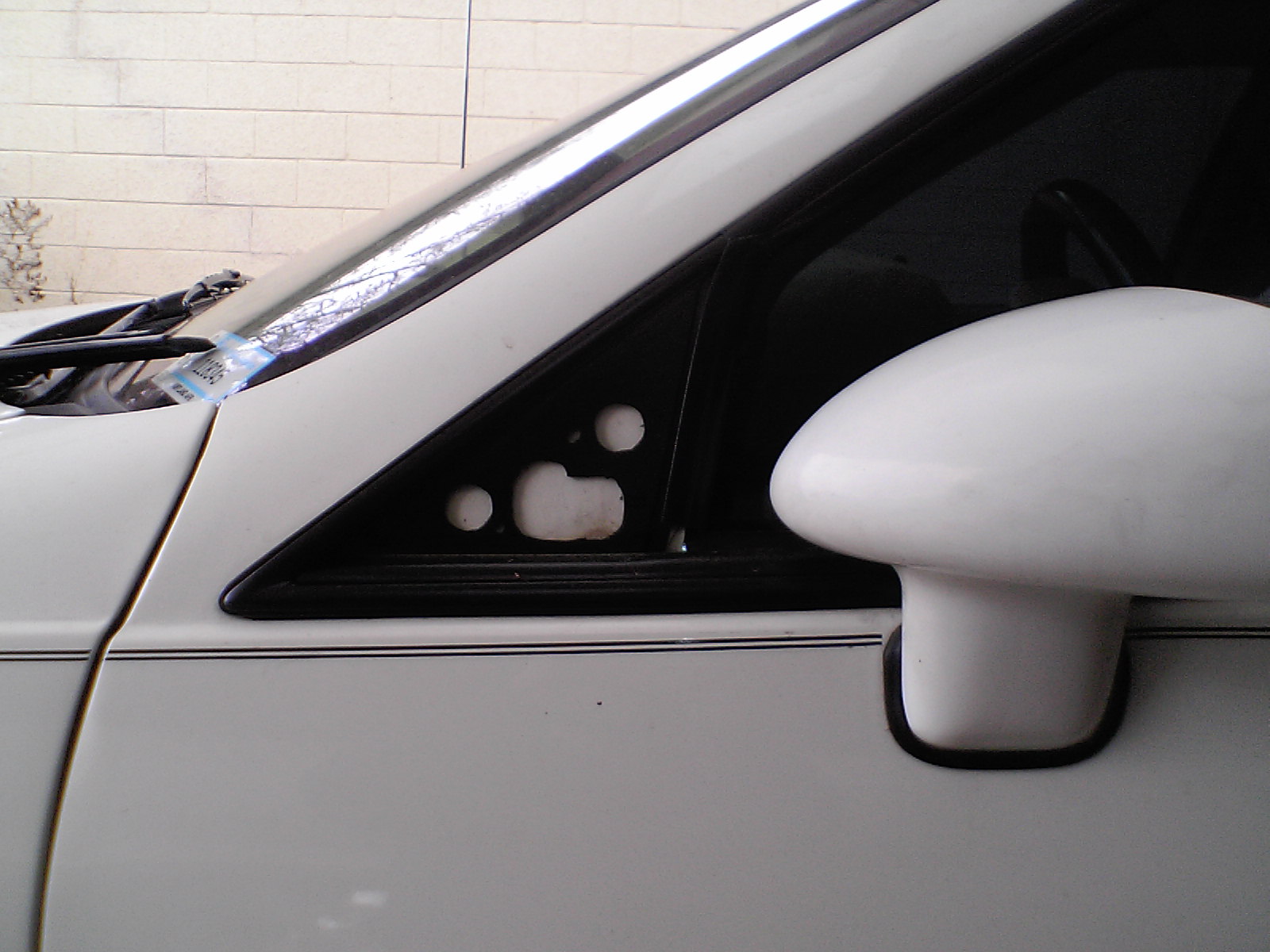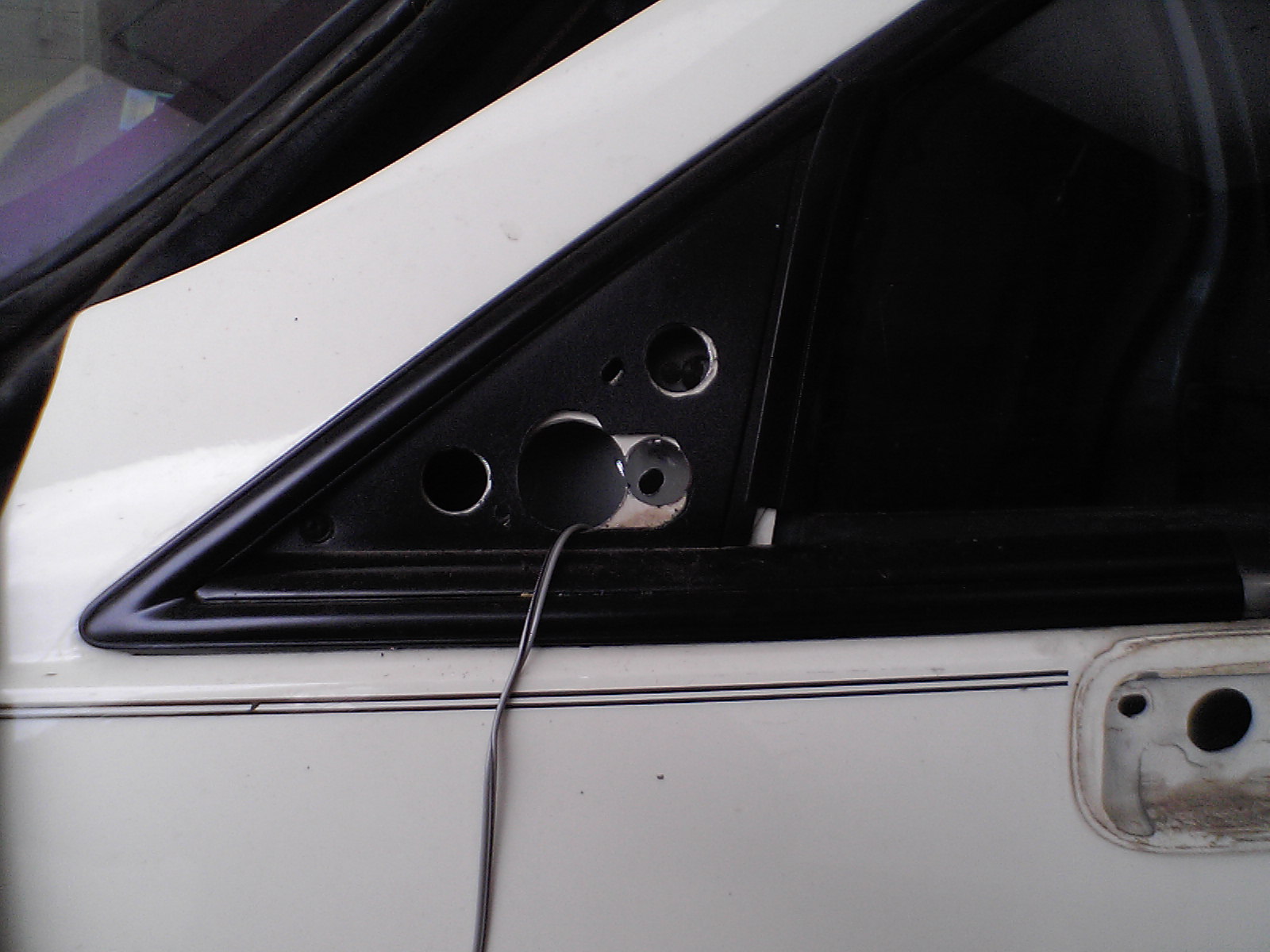 On the inside of the door using the 1/4 inch holes that you drilled thru the door as guides drill the 3/4 inch holes only thru the skin. Once thru you will see the reinforcement and that's where the mirror bolts/studs will bolt to. Unplug the stock mirror and remove the two nuts that hold the mirror and set it aside. Hold the new mirror in the new place and loosely start the two rear bolts then using a ~1/2 long bolt you can reach inside the door up to the front hole in the door to the mirror and tighten the bolt. Removing the door speaker will give you to reach thru there and install that bolt. Tighten the other two bolts then make very sure the mirror wire goes behind the window track and plug it into the door harness. If you want to temporary plug the mirror switch back in you can test to make sure everything works.