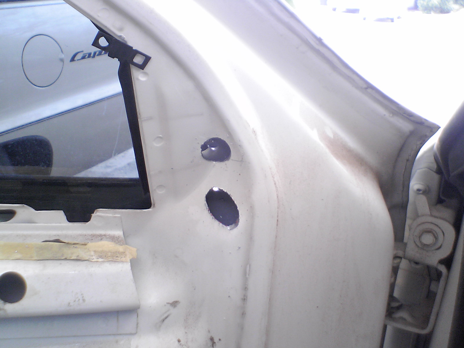 Remove the door panel and unclip the upper window trim so you don't drill thru it. Match drill the two holes for the mirror alignment pins 11/64. The upper one is slightly slotted. Then match drill the three bolt/stud holes for the mirror mounts. I used a 3/4 hole saw w/ 1/4 inch pilot drill that was extra long. After sawing out the front hole I discovered that there is not any reinforcement behind it so when I drilled the passenger side I only drilled the 1/4 inch hole. Also cannot use the stud that's on the mirror so I removed it. I don't know about later years if that is present. Once you have the two 3/4 inch holes drilled then slide the hole saw thru the hole and drill the two 1/4 inch holes in the reinforcement then the inner door skin. I used a 1 5/16 hole saw to drill the opening for the wiring to pass thru but think a 1 inch would work just fine.