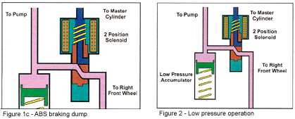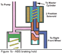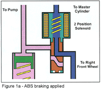 Basic system operation is the same as all other ABS systems. Wheel speed is monitored by the EBCM for impending lockup once the driver applies the brake. Like other systems, the Bosch 2U uses brake switch input to determine if the brakes are being used. If one or more of the wheel-speed sensors indicate an impending lockup, the EBCM will "pump" that wheel to prevent it from happening. The method used to pump the brakes is usually the biggest difference between the various ABS systems in use. The typical modulator usually uses two solenoid valves per wheel to control wheel lockup. One is used to isolate the wheel, while the other is used to release the pressure trapped in that wheel circuit. Most Bosch system utilizes a modulator that requires only one solenoid valve per wheel. This unique modulator is able to place each wheel’s solenoid valve in two different positions by varying the current supplied to the solenoid electromagnet. Figures 1a, 1b and 1c show schematics of one of these solenoid valves in its different locations. Figure 1a is the position the valve spends most of its time at which is the brake released and non-ABS braking mode. In this position fluid travels through the solenoid unrestricted. Figure 1b shows the Pressure Hold Mode. The EBCM energizes the solenoid electromagnet with 2.5 amps. This amount of current pulls the solenoid plunger into a midway position that isolates the wheel from the rest of the system.