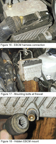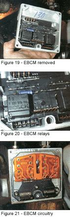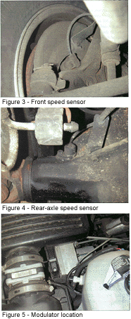 The rear speed sensor is located in the front of the rear differential. Its connector is located on the left-hand frame rail just in front of the tire. The acceptable resistance range for a rear sensor on a Bosch 2U system is from 1470 to 1730 ohms. Figure 14 shows our rear sensor measuring at an acceptable 1613 ohms. Figure 15 shows the visual inspection process involved in checking the rear speed sensor and tone ring. It was nice to see that even though our example vehicle was six-years old and had lived its entire life in the rust belt, neither sensor was difficult to remove. While not common on these systems, EBCM and modulator faults can occur. The simplicity of the system enhances service of either the EBCM or BCM. The first advantage comes from access to the unit. Unlike units such as the Bendix 4 where the battery and battery tray have to be removed, access to the Bosch 2U assembly is simple. In our case we had to remove the air intake at one end and push it to one side. The service procedures say the removal of the radiator side of the upper radiator hose is necessary to service or remove the unit. On this vehicle I found this was not necessary. The following procedure is used to R & R the EBCM. The steps involved in replacing the BCM are the same as the steps involved in separating the EBCM from the BCM with the addition of disconnecting the brake lines. Either process should only take 15 minutes. After the necessary clearance is obtained, disconnect the wiring harness connector from the EBCM by pulling up on the lock down lever shown in Figure 16. Next, loosen, but do not remove, the three mounting bracket bolts. Once loose, wiggle the assembly out of its mounting bracket and support it with a block of wood. The service manual procedures say to unbolt the brake line frame mounting bracket to provide the necessary slack, but I found on this model it wasn’t that necessary. Make the decision based on the condition of the brake lines. Once the assembly has been supported. remove the EBCM to BCM mounting bolts (Figure 17). There is a "hidden" mounting bolt under the front rubber bracket mount you will have to remove before you can separate the EBCM from the BCM. Simply slide the rubber mounting off the hexagon bolt head to gain access, as shown in Figure 18. After all the bolts have been removed the EBCM can be removed from the BCM (Figure 19). The EBCM on this model is a one piece assembly and cannot be serviced. Integral parts of the EBCM on this model are the two relays shown in Figure 20. One relay is used to energize the pump motor, while the other one supplies power to the solenoid circuit. In this model, these relays are not serviceable, but older units allow these relays to be replaced individually.
