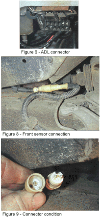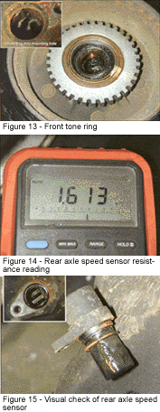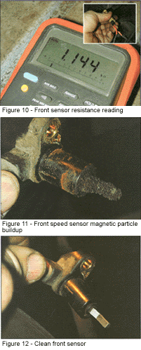 Figure 7: 21 — Right front wheel-speed sensor fault. Circuit or sensor problem with ignition "ON" and vehicle in motion. 22 — Right front toothed wheel frequency error — Circuit or sensor problem with ignition "ON" and vehicle in motion. 25 — Left front wheel-speed sensor fault — Circuit or sensor problem with ignition "ON" and vehicle in motion. 26 — Left front toothed wheel frequency error — Circuit or sensor problem with ignition "ON" and vehicle in motion. 35 — Rear axle speed sensor fault — Circuit or sensor problem with ignition "ON" and vehicle in motion. 36 — Rear axle toothed wheel frequency error — Circuit or sensor problem with ignition "ON" and vehicle in motion. 41 — Right front valve solenoid fault — Solenoid position not as commanded. 45 — Left front valve solenoid fault — Solenoid position not as commanded. 55 — Rear valve solenoid fault — Solenoid position not as commanded. 61 — Motor pump circuit fault — Voltage at relay without EBCM command or voltage not at relay within 60 milliseconds of command. 63 — Solenoid valve relay fault — Voltage at relay not correct as commanded. 71 — Electronic brake control module (EBCM) fault — Internal problem detected in self testing. 72 — Serial data link fault — Three consecutive data link transmission errors. As you can see, six of the 13 possible codes involve the wheel-speed sensors. Wheel-speed sensor failures are the most common type of ABS problem being encountered. The speed sensors on our Roadmaster are easy and straight forward to diagnose and service. One the most common tests performed during speed-sensor diagnosis is a resistance test of the sensor coil. The front sensor connectors are located on the top of the frame rail, behind the upper control arm, as shown in Figure 8. Figure 9 shows how this type of connector usually provides a good seal against the elements. Checking for moisture intrusion and corrosion at connectors is an important part of the diagnostic process. The resistance valve for a front sensor should range between 1015 and 1245 ohms. Our Roadmaster front sensor measured right in the middle at 1144, as shown in Figure 10. Although not always part of the flowchart, a visual inspection of both the speed sensor and tone ring is usually a good practice to follow. The build up of metal filings shown in Figure 11 could be enough to affect the sensor output and trip a code. This type of build up can be easily cleaned, as shown in Figure 12. The tone ring can be inspected through the sensor mounting hole in the steering knuckle or by removing the rotor (Figure 13). This type of tone ring is not generally exposed to much that could harm it. When replacing rotors, make sure the new rotors not only are equipped with the tone ring, but that it is the same size and has the same number of teeth.